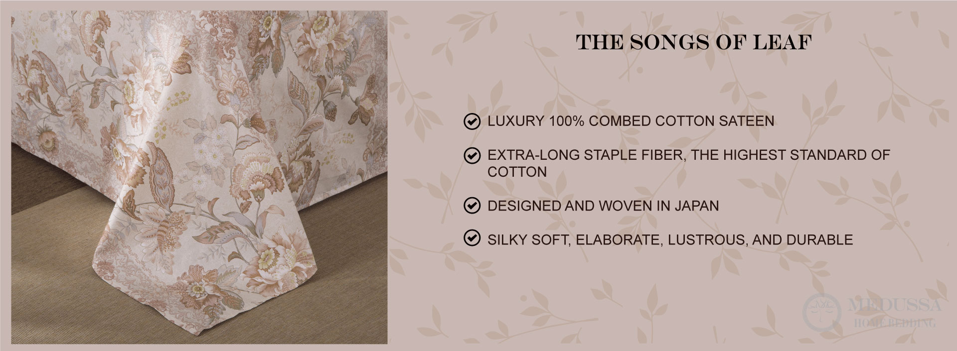 This luxury 100% Cotton Sateen bedding set, designed and Woven in Japan, is made of extra-long staple fiber combed cotton, the highest standard of cotton in the world.